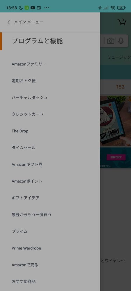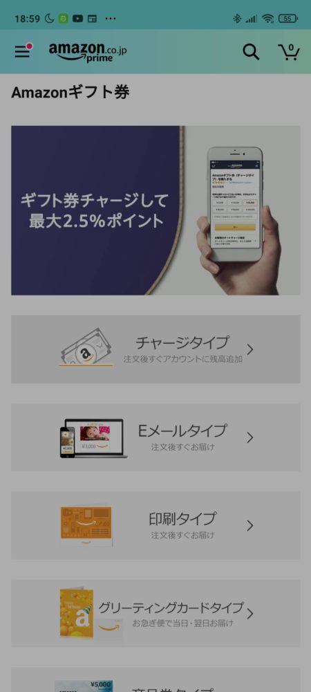 Amazonのページから左上の三本線をタップしてAmazonギフト券を選択します。