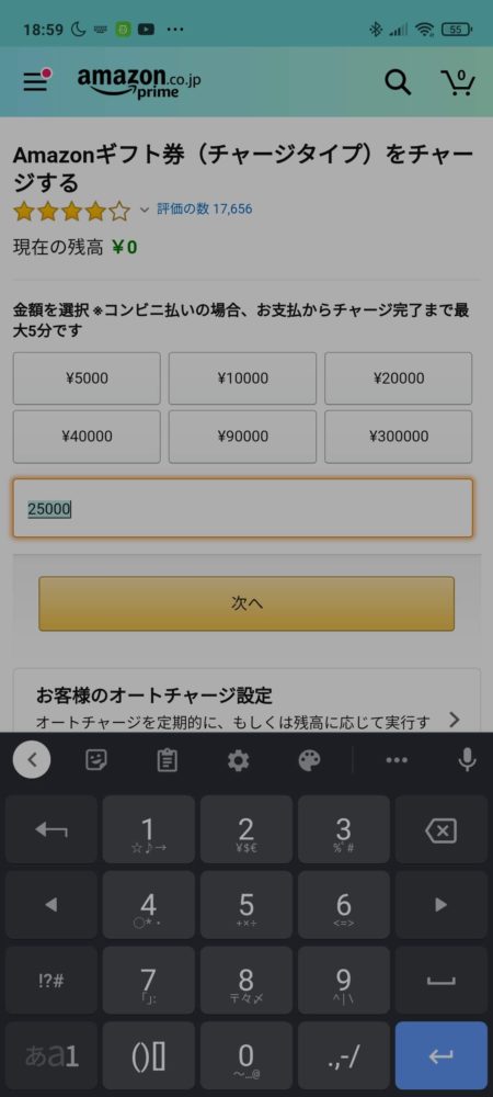 チャージタイプを選択。チャージ選択してEdyの金額を入力します。