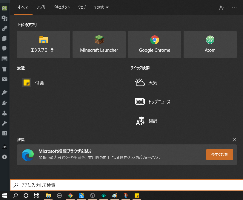 Windows画面の左下にあるWindowsキーの右の虫眼鏡マークを押すとこの画面になるので、ここですかさず「付箋」と入力してあげます。