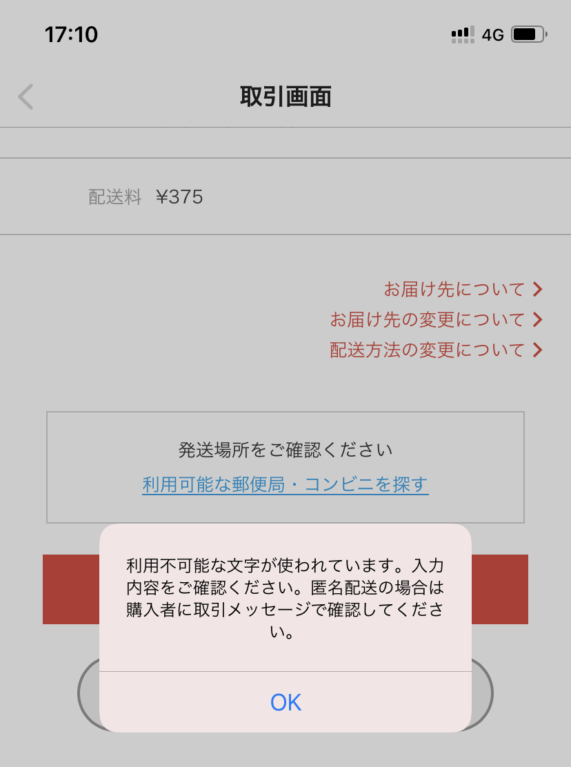 「利用不可能な文字が使われています。入力内容をご確認ください。匿名配送の場合は購入者に取引メッセージで確認してください。」