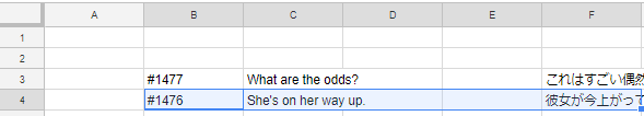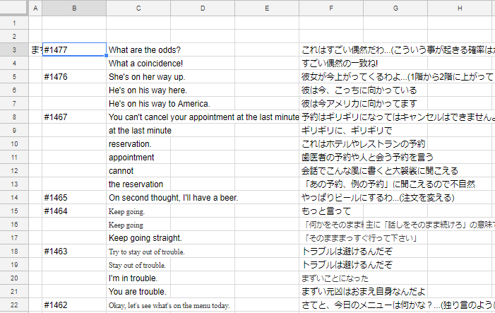 例えばこのような表があったとして、B列のナンバーのあるところだけを別のシートに移していきたい場合・・・(エクセルなら他にもいろいろできますが、ウェブからコピーする場合とかだと思ってください・・・)