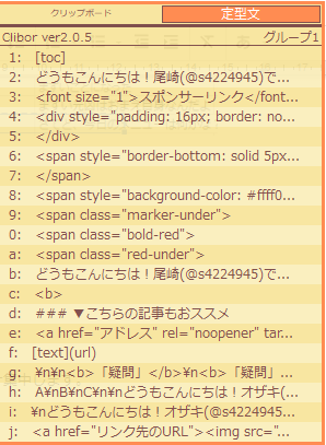 一般的に定型文として記録しておきたいことをCliborに覚えさせますが、まずはHtmlなどを使う人はタグを覚えさせておくのはなかなかよい方法だと思えます。
