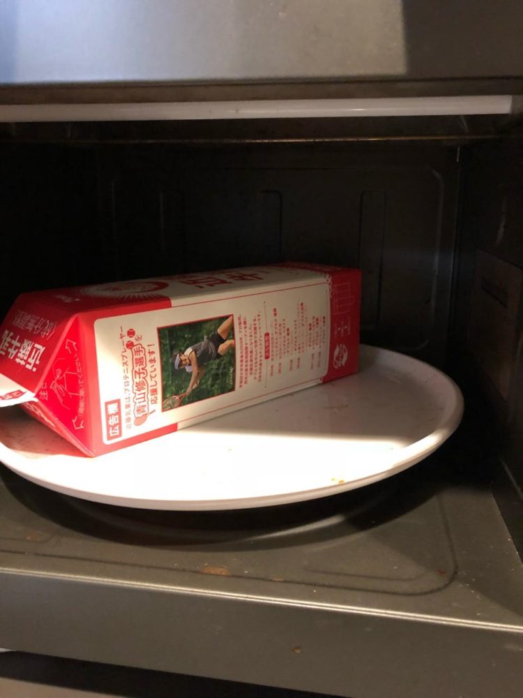 鍋に水入れて温めてから牛乳パックごと入れちゃいます。