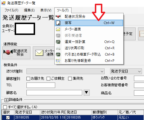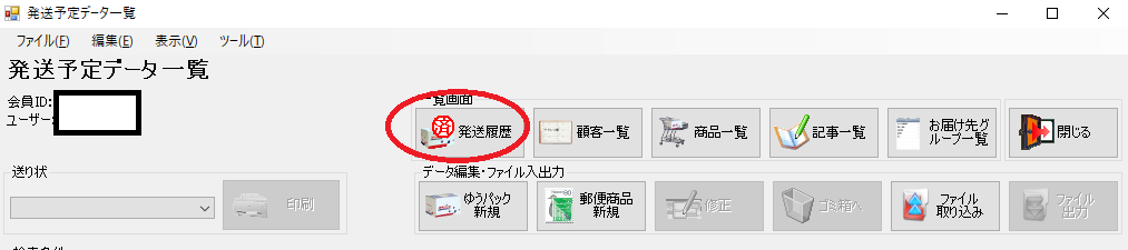 そして発送予定データから「発送履歴」を選択します。