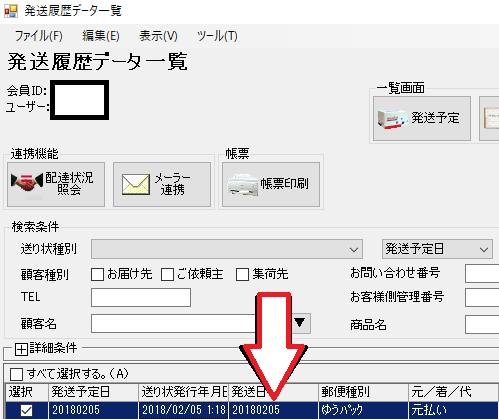 「発送履歴データ一覧」の中から再印刷をしたい発送履歴をハイライトさせておきます。